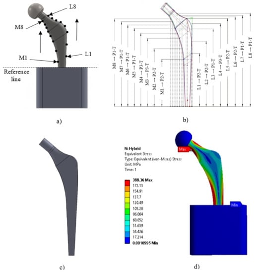 (a) Locations of 8 points in the medial side and 8 points in the lateral side of the implant. (The number of points increases upwards in both parts of the implant, M1 “Medial 1” and L1 “Lateral 1”). (b) Locations of the points that showed the best stress and strain results of the different stems evaluated, where (MX/LX → PX-T) represents the path assessed at each of the generated reference points (M1-M8 and L1-L8); P1, P2, and P3 represent the profile numbers; and the letter represents the type of cross-section (T = trapezoidal). (c) Design implant proposal. (d) Maximum stress with the hybrid profile using the load of activity 4 (Down stairs) and the stainless steel material (SS316L).