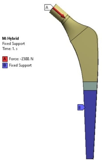 A 3 kN load simulating the load corresponding to an average person of 75 kg walking was applied at the top of the femoral head for the reproduction analysis, which corresponds to the first activity of Table 3. The 10-node quadratic tetrahedron elements were used with linear formulation for the supporting block, the femoral head, and all the stems assessed. This element has been previously used because of its capacity to perform assessments on discontinuous solids, aided by the three degrees of freedom in their nodal-translation of each node: x, y, and z directions [2,15,29,31].