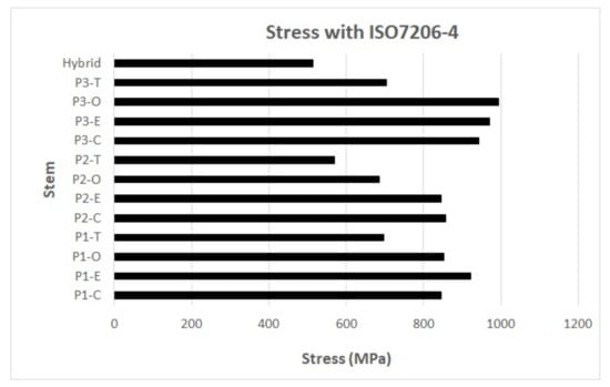 Finally, another study was carried out on the hybrid implant using the ASTM F2996-13 (see Figure 5) and the loading conditions of the ISO 7206–4: 2010 (E) [28], to observe the performance of this design with respect to the other configurations (P1, P2 and P3 with the circular cross-sectional area, ellipse, oval, and trapezoidal).