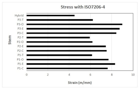 The results of the different stems assessed with ASTM F2996-13 and ISO 7206–4:2010 (E) [28] are presented in Figure 6 and Figure 7; note that the hybrid design shows the lowest equivalent von Mises stress and strain.