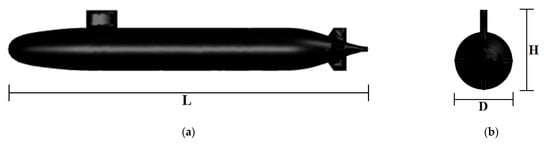 Main and side views of the SUBOFF submarine model. (a) Main view and (b) Side view.