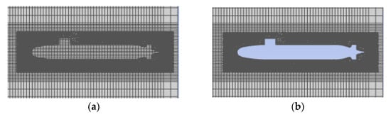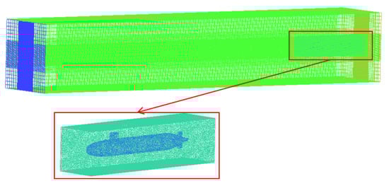 When the submarine navigates, the submarine grid moves in a large basin; therefore, the submarine and basin grids represent the foreground and background grids. After the grids overlap with each other, the excavation operation constitutes the computing domain, as shown in Figure 3. Compared with the traditional mesh, the biggest advantage of such an overset mesh is that it can realize the large motion of the submarine, and the mesh will not be deformed in the process of moving, which can ensure the correctness of the numerical simulation.