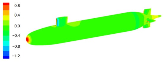 Based on the data provided by Gorski in 1990, the Defense Advanced Research Projects Agency (DARPA) measured the pressure and friction resistance coefficients of the SUBOFF model. In this study, the rationality of the CFD calculation was verified by comparing the pressure and friction resistance coefficients with the measured data. Table 2 presents a comparison between the total resistance and the test value calculated using the numerical value in this study. Notably, the total resistance value calculated by the simulation is close to the experimental value, and the error is 2.8%.