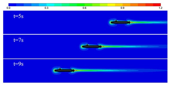 Figure 5 shows the wake evolution of the submarine during the process of movement at a uniform speed of 2.5 m/s. We observed that the flow fields at the head and tail of the submarine are the same at different times. With an increase in the navigation time, the wake becomes longer, and the far-field wake gradually decays.