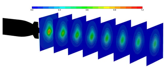 Figure 6 shows the cross-section of the submarine wake at t = 10 s. The front end wake that receives the submarine cross tail wing has a great influence and presents a cross shape with wake evolution, and the back end wake gradually decays to the circle.