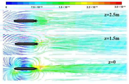 Figure 7 shows the cross-section of the wake magnetic field at different altitudes above the submarine. Notably, with an increase in the vertical distance from the submarine, the wake magnetic field around the submarine gradually weakens, but the attenuation of the far-field wake of the submarine is slow.