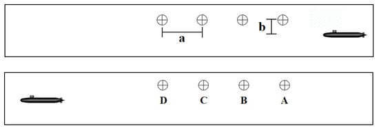 To facilitate the feature extraction of the magnetic field signal, we set up four wake magnetic field monitoring points before calculation, which were located 1.5 m above the submarine (b = 1.5), and the distance between the two monitoring points was 2 m (a = 2). The relationship between the monitoring point and the position of the submarine is shown in Figure 8, wherein the diagram at the top shows the relationship between the starting position of the submarine and the monitoring point, and that at the bottom shows the relationship between the end position of the submarine and the monitoring point.