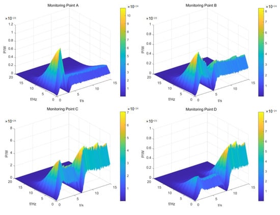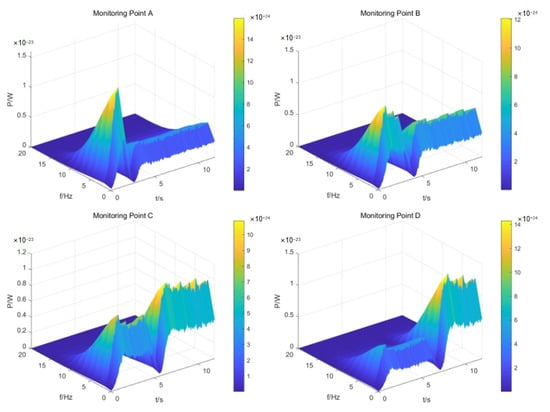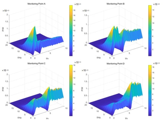 Figure 9 shows the time-frequency domain diagram of the magnetic field at monitoring points A, B, C, and D when the underwater vehicle was moving at a speed of 2 m/s.