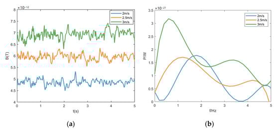 According to the wave theory, the wave number of the wake of an underwater vehicle is determined by ship speed and gravity and can be expressed as . The frequency correlation term of the wake fluctuation is . According to the dispersion relationship , when an underwater vehicle navigates at speed , the frequency correlation term can be expressed as , while the magnetic field and wake fluctuation have the same frequency correlation term; therefore, the larger the speed, the smaller the frequency of the wake magnetic field is. Notably, the simulation results are in accordance with the theoretical calculation.