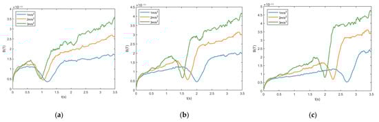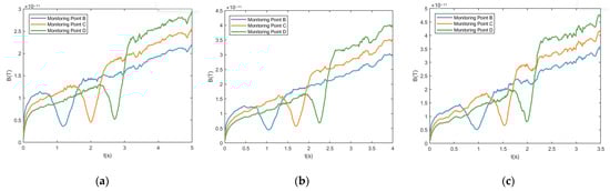 The time domain contrast diagram of the magnetic field at the same monitoring point when the submarine moved with different accelerations. Monitoring points (a) B, (b) C, and (c) D.