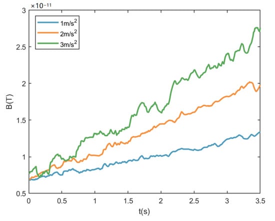 As the wake of the underwater vehicle at monitoring point A is fully developed, the influence of acceleration on the wake magnetic field was analyzed. Figure 16 shows the variation in the magnetic field with time under different accelerations at monitoring point A. Notably, the growth rate of the magnetic field increases obviously with increasing underwater vehicle acceleration: when the submarine moves at accelerations of 1, 2, and 3 m/s2, the growth rates of the wake magnetic field are 1.78 × 10−12, 3.77 × 10−12 and 5.55 × 10−12 T/s, respectively, as presented in Table 4. We verified the above conclusions by measuring the magnetic field growth at different accelerations at monitoring points B, C and D.