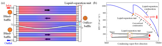 The vapor phase is generally converted into the liquid phase during condensation. The condensate accumulates on the heat transfer surface and the liquid film becomes thicker and thicker, leading to the increasing of thermal resistance and flow resistance. Peng et al. [1] proposed the concept of “liquid-separation condensation” to enhance the condenser performance. The configuration of a liquid-separation condenser (LSC) is shown in Figure 1a. The condensate can be promptly removed by the vapor-liquid separator in the headers. To deal with the alleviated mass flow rate due to the liquid drainage, the flow area should be shrunk accordingly to keep the pace of variations in mass flux. In this way, the thickness of the liquid film is largely reduced and the vapor quality is significantly improved, which finally enhances the heat transfer coefficient (HTC), as shown in Figure 1b.