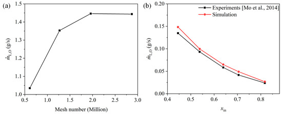 The geometry of the header is discrete by the hexahedral mesh (Figure 2) and the first layer of the mesh is set in the sub-layer region, in which y+ is larger than 11.225. Moreover, four sets of cases with different mesh numbers are simulated for the mesh-sensitive test. Figure 3a shows that when the mesh number is more than 2.03 million, the liquid drainage rate by the orifice (ṁL,O) changes insignificantly. Hence, to balance the calculation consumption and the accuracy of the numerical model, the mesh number of 2.03 million is selected, in which the minimum orthogonal quality, the maximum ortho skew and the aspect ratio are 0.54, 0.43 and 2.53, respectively.