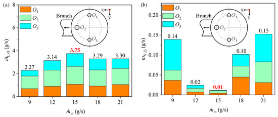 To obtain a deep understanding of the flow characteristic and discover the causes of deteriorated vapor-liquid separation performance, the mass flow rates of the liquid drainage and vapor leakage through the orifices, i.e., ṁL,O and ṁV,O, are analyzed, as shown in Figure 5. As mentioned above, there exists a strong liquid impact at the right side of the baffle, O2, being the furthest away from the liquid impact, has a higher ṁL,O than O1 and O3. Different from η that is peaked at ṁin = 12 g/s, the peak of ṁL,O = 3.75 g/s appears at ṁin = 15 g/s. This is explained as: compared to ṁin = 12 g/s, ṁin = 15 g/s has a higher ṁL,O because of a larger driving force, but its FL is much smaller owing to the more liquid within ṁin, leading to a lower η given that FV in these two cases are negligible (see Figure 5b). ṁL,O maintains at around 3.30 g/s when ṁin is 18 g/s and 21 g/s. Meanwhile, ṁV,O weakens the vapor-liquid separation performance, derived from Equations (11) and (12). As seen in Figure 5b, ṁV,O has an opposite trend to ṁL,O. It decreases at first when ṁin is smaller than 15 g/s and then increases to 0.15 g/s at ṁin = 21 g/s. The vapor only leakage about 0.02 g/s and 0.01 g/s as ṁin equals to 12 g/s and 15 g/s, respectively. This is due to the liquid film above the orifice-baffle in these two cases being able to resist the impact of the liquid flow from the wall, in which the orifices are rarely affected by the fluid impact and only a small amount of vapor leakage. Conversely, much vapor leakage out from the orifice under the other three ṁin because of the unstable liquid film above the orifice-baffle. Moreover, the vapor is escaped out from O2 is less than that from O1 and O3 owing to its farthest distance away from the liquid impact.
