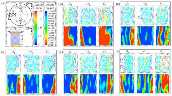 (a) Instructions and distributions of velocity and density in each orifice at (b) 9 g/s, (c) 12 g/s, (d) 15 g/s, (e) 18 g/s and (f) 21 g/s.