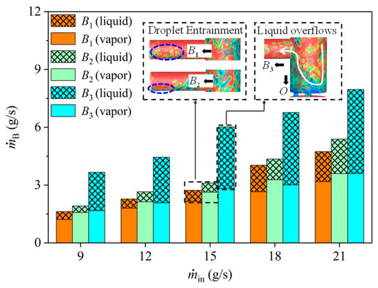 As shown in Figure 7, the maldistributions of ṁB and xB in the branch outlets are rather significant. The liquid mass flow rate in each branch outlet (ṁL,B) increases with the increasing of ṁin. Moreover, the liquid flows into the header and jets on the header wall of the header. A part of the liquid breaks up into droplets that are thereafter dragged into the branch outlets by the vapor, which is termed as “droplet entrainment”. A similar phenomenon was also found by Li [12] and Zheng [20]. Obviously, ṁL,B in B3 is remarkably higher than that in B1 and B2. This is because the liquid flows to B3 is not only by droplet entrainment, but also comes from the overflowing liquid from the orifice-baffle that cannot be drained promptly. However, the vapor in the branch outlet is more uniform than liquid owing to its lower inertia force. ṁV,B in B1 is slightly lower than B2 and B3 for the considered ṁin.