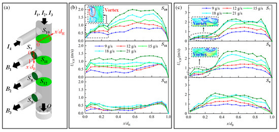The droplets which enter the branch outlet is mostly due to the drag of the vapor. Hence, the vapor velocity is essential. To further explore the vapor flow characteristic, the vapor velocity distribution along each branch outlet and the specific header planes are plotted in Figure 8. The two-phase fluid flows from the branch inlet I4 and mixes in S10. Due to the inertia, the fluid gathers on the right side of the header and a vortex is generated on the left side, resulting in the vapor velocity on the left side being lower than that on the right side. After S10, the fluid continues to flow downwardly, and then a part of it is divided into the B1 because of the suction of the branch outlet. The fluid is more accumulated at the lower part of B1 due to the inertia (S7), in which the vortex exists above the B1 and shows a vapor velocity non-uniform distribution. The other part of the fluid from I4 that cannot enter B1 in time will keep flowing in the header. In this way, the fluid also flows on the left side, resulting in a lower non-uniformity at S11. Similarly, the vapor velocity distribution in the next branch outlet (S8) and header (S12) are close to the S7 and S11 respectively. However, due to the diversion of the fluid, the vapor velocity decreases correspondingly. On the other hand, in the B3, the distribution of the vapor velocity is more uniform. This is mainly due to the fact that B3 has a maximum mass flow rate than B1 and B2, in which case the fluid can be fully fill at the B3, where there is no vortex generated. With the increase in ṁin, not only does the velocity increase but it also improves the non-uniformity of the velocity distributions.