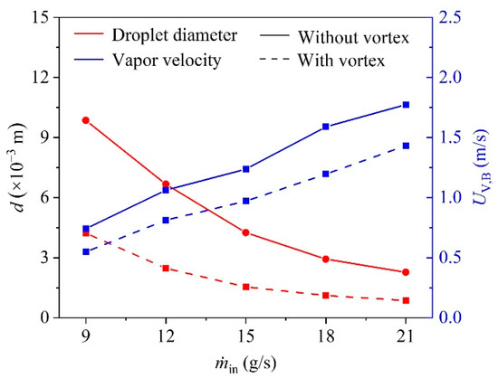 Taking B1 as an example, Figure 9 demonstrates d in the header and the vapor velocity in B1 with and without vortex. It is observed that an increase in ṁin leads to an enlarged droplet diameter and decreased vapor velocity simultaneously. In addition, the existence of the vortex decreases the droplet diameter by up to 1.76 times and increases the vapor velocity in the branch outlet by 35.10%, which significantly affects the forces of the droplet.