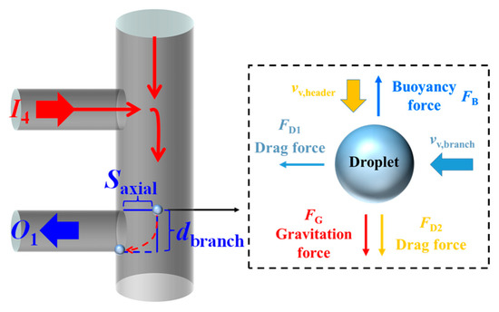 When the droplets flow into the intersection of the header and the branch outlet, the axial distance for droplets to be entrained to the branch outlet is Saxial and the vertical distance is the diameter of the branch outlet (dB), as shown in Figure 10. If the flowing time of droplet in the vertical direction tvertical is longer than that in the axial direction taxial, the droplet will be entrained to the branch outlet. Therefore, the critical point for the droplet entrainment is defined at tvertical = taxial. In this way, the critical vapor velocity (UV,C) required to entrain the droplet can be obtained when the droplet in the branch outlets is located in Saxial, as calculated as in Equations (13)–(15).