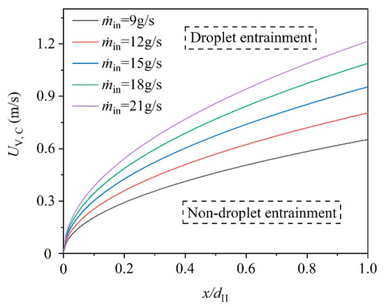 It can be observed that UV,C is highly correlated to the velocity of both phases in the header, the vapor velocity in the branch and d UV,C at the different axial locations under various ṁin is plotted in Figure 12. Clearly, the larger Saxial requires a higher UV,C to entrain the droplet and the growth rate of the UV,C decreases as the Saxial increases. Moreover, under the same axial location, for the droplet to be dragged to the branch outlet needs a higher UV,C when ṁin is increased. This is mainly due to the smaller d at higher ṁin, causing the larger acceleration and the shorter flow time tvertical in the vertical direction.