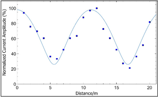 Current amplitude distribution along the loop (normalised (%); measurement points and fitting to a stationary wave envelope function).
