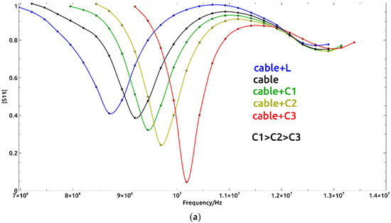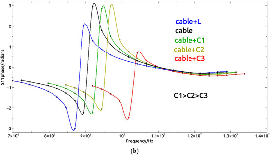 For a chosen carrier frequency, a loop length is fixed to fulfil the above condition; however, the length of the loop is an imposed parameter depending on the physical dimensions of the installation, and therefore it is necessary to find a way to adjust the natural loop resonance to match the frequency of the carrier. The insertion of a coil in series with the cable loop has the effect of increasing the electrical length seen by the signal (length expressed as a wavelength multiple), that is to say, the loop will resonate at lower frequencies. The opposite of this behaviour is seen with the insertion of a capacitor. As such, the insertion of a reactive component in series with the loop could be used to perform the matching between the carrier and loop resonance frequencies. This effect is shown in Figure 3 from our measurements over a typical PV string cable loop 20 m long with a vector network analyser (VNA) connected to the loop, where the resonance condition is recognized by the minimum in the modulus of the S11 scattering parameter (maximum power sent to the loop) and a sudden change in its phase. Figure 3 shows curves around the first resonance frequency (9.192 MHz without compensation) corresponding to the connection in series of a coil, three values of capacitors and the raw cable.