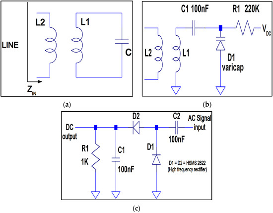 Schematic of tuning circuit in (a) its generic representation and (b) actual implementation, and (c) schematic of voltage doubler detection circuit.
