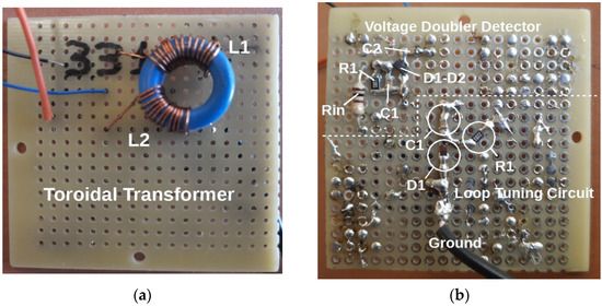 The carrier amplitude through the primary coil in the circuit in Figure 4a will show a maximum if the loop is pushed to resonance, so if this signal is used as an input for a voltage doubler detection circuit (Figure 4c), we will obtain at the output a DC voltage proportional to the amplitude of the carrier in the loop and the resonance can be detected as a maximum in the DC voltage output. Finally, automatic resonance adjusting can be implemented by sampling the detector DC output with an analogue-to-digital converter (ADC) integrated in the microcontroller (MCU), where the convenient firmware will search for a maximum outputting a DC voltage sweep towards the tuning circuit.