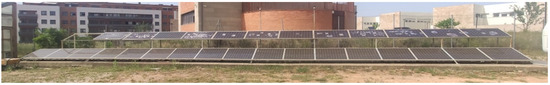 The PV plant used is shown in Figure 6. This plant is located on the facilities of the Duques de Soria campus of the University of Valladolid. The campus is in the city of Soria, Spain. The modules used in this article for the communication line are those on the upper row. Each module has the characteristics shown in Table 1.