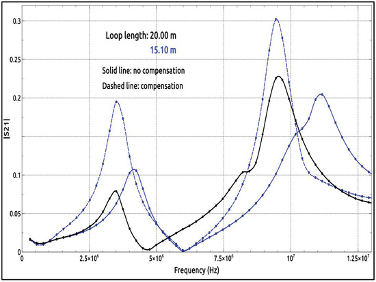 Figure 7 shows the action of the compensation described, where a 20-m-long loop was kept in resonance at 9.5 MHz initially with the corresponding control voltage of 5 V. Then, the length of the loop was shortened to 15.10 m, and with the resonance control electronics off, the resonance frequency was displaced to 11.1 MHz. If we then switched on the electronics, the control voltage was readjusted by the MCU to get the resonance back to 9.5 MHz. All the electronics described above could work to keep the resonance condition on any of the two modes described in Section 2. The S21 modulus was measured with a VNA connected in series with the loop, the tuning circuit and a 50-ohm load. Maximums show the frequencies of minimal attenuation of the propagation along the (loop)-(tuning circuit) chain. The black trace corresponds to the 20 m cable with a control voltage of 5 V in the tuning circuit, where the maximum is over the chosen carrier frequency (9.5 MHz). The blue solid trace corresponds to a variation in the loop length from 20.00 m to 15.10 m with no change in control voltage, and the new maximum is over 11.1 MHz and the carrier (9.5 MHz) is attenuated from |S21| = 0.228 to 0.100. The blue dashed trace corresponds to the new loop length (15.10 m) after the tuning circuit action for compensation, leading to a control voltage of 0.9 V, and the maximum is back over the carrier at 9.5 MHz.