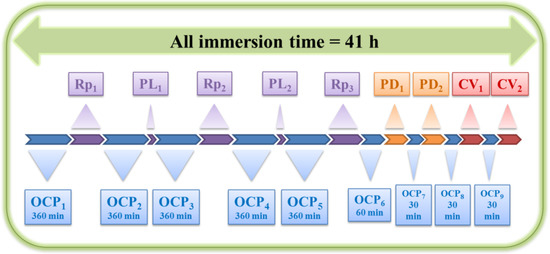 Schematic of the Zr2.5Nb alloy electrochemical corrosion assessment protocol in Ringer’s solution, staged according to the order and time required for each measurement.