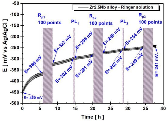 From Figure 2, it can be seen that the immersion potential has a value of E = −450 ± 21 mV vs. Ag/AgCl reaching at the end of the 38.5 ± 6 h a value of E = −241 ± 13 mV vs. Ag/AgCl. This shift of the potential to nobler values demonstrates that a layer of passive oxide is formed on the surface of the Zr2.5Nb alloy. This tendency to move towards more positive values was also observed by other authors when studying the corrosion behavior of different commercial alloys in Ringer’s solution [16].
