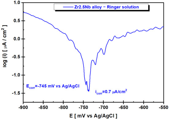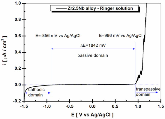 For the Zr2.5Nb alloy, the potentiodynamic polarization test was performed in a potential range from −1.5 V vs. Ag/AgCl at +1.2 V vs. the reference electrode with a scanning rate of potential equal to 3 mV/s. The potentiodynamic polarization curve of the Zr2.5Nb alloy immersed in Ringer’s solution is shown in Figure 6.