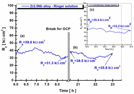 Evolution of the polarization resistance of the Zr2.5Nb alloy in Ringer’s solution: (a) the polarization resistance segment (Rp1), (b) the polarization resistance segment (Rp2), and (c) the polarization resistance segment (Rp3).