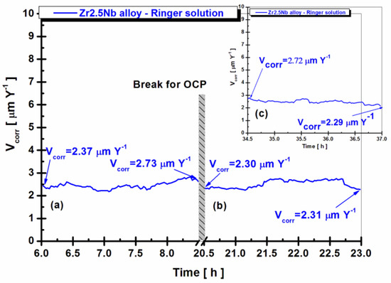 Figure 5a shows that the corrosion rate recorded for the Zr2.5Nb alloy in the first segment reaches a value of Vcorr = 2.37 ± 0.9 μm/year. After about 21 h, the value of the corrosion rate reaches 2.31 ± 0.5 μm/year. At the end of the 37 h, it has a value of 2.29 μm/year. This decrease is a relatively small difference between the value of Vcorr after 6 h and at the end of the 37 h, which is 0.08 μm/year.
