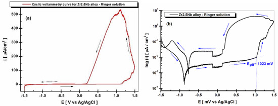 Cyclic voltammetry is initiated in the negative direction (−1.5 V relative to the reference electrode) to the positive direction (+1.5 V relative to Ag/AgCl) with a scanning speed of 3 mV/s. The scanning direction is then reversed after the anodic current has reached the corresponding value at +1.5 V relative to Ag/AgCl to form a complete cycle. The recorded diagram for the Zr2.5Nb alloy immersed in Ringer’s solution is shown linearly in Figure 7a and on the logarithmic scale of the current density in Figure 7b.
