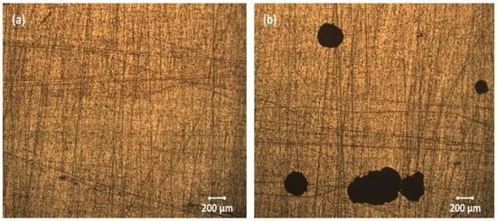 The OPTIKA XDS3 MET optical microscope, running with Vision Pro assistance software, was used to highlight the electrochemical changes suffered by the surface of the Zr2.5Nb alloy before and after the electrochemical corrosion tests. The micrographs shown in Figure 8 provide information on the surface state of the Zr2.5Nb alloy, before (a) and after (b) electrochemical testing in Ringer’s solution.
