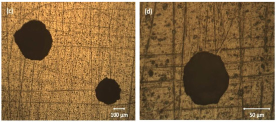 After the corrosion tests Figure 8b, it is observed the appearance of smaller and larger corrosion pits that are found on the entire surface of the sample, and can be better observed in Figure 8c,d. Thus, after analyzing the images obtained from optical microscopy, we can say that the results of electrochemical tests revealed by cyclic voltammetry are consistent with the results of optical microscopy.