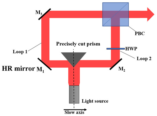 The beam quality of a diode laser can be described as the product of divergence angle and beam waist [11], and the brightness is defined as the radio of power and beam quality [12]. Beam combining methods, such as spectral beam combing (SBC) [13,14,15], polarization beam combining, and coherent beam combining (CBC) [16,17,18], are able to enhance the brightness of lasers system via combining more laser elements to increase the power. However, the beam quality of SBC is limited by the emitters and the output coupler, and diffraction grating brings inevitable power loss. CBC with low efficiency is complex and sensitive to the environment, which limits the application in many fields. It is difficult to improve the beam quality except for the external-cavity beam combining.