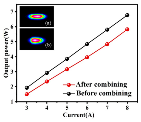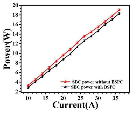 Figure 5 shows the power-current characteristics of the SBC with (black balls) and without (red balls) BSPC under CW operation. The power was measured by Ophir FL500A at the coolant temperature of 18 °C. As can be seen, the output power of the SBC without BSPC at 36 A was 19.65 W. With the same current injection, the output power of the SBC with BSPC was 18.26 W, with only approximately a 7% loss.