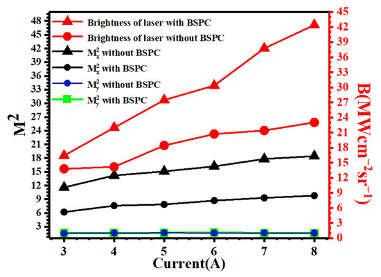 The dependence of M2 factors and brightness B of the laser with and without BSPC on injection current.