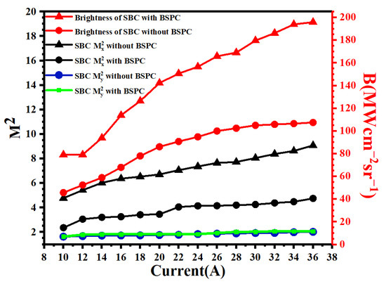 Figure 6 also shows the brightness of the SBC with and without BSPC. It can be seen that the brightness B achieved by the SBC was about 108.4 MW cm−2 sr−1 at 36 A. The brightness increased to 195.8 MW cm−2 sr−1 by the same SBC with BSPC at this injected current, which corresponded to an improvement of 80.6%. The above results demonstrate that the proposed BSPC method was also suitable for the combined laser beam. The precondition is that the beam has the high purity of polarization.