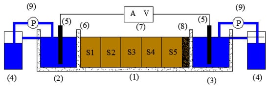 A schematic diagram of the experimental reactor for electrokinetic remediation: (1) Soil chamber, (2) Anode chamber, (3) Cathode chamber, (4) Electrolyte solution reservoir, (5) Graphite electrode, (6) Plexiglass and filter paper, (7) DC power supply, (8) PRB (9) Peristaltic pump.