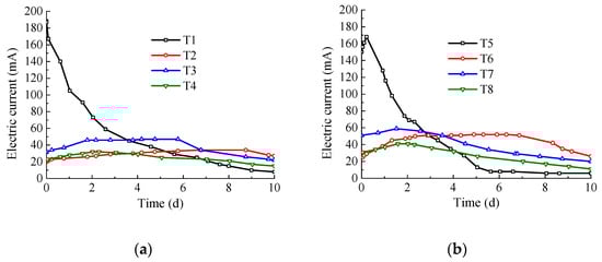 Figure 2 shows the change in electric current during the 10-day electrokinetic remediation. The currents of T1–T8 at the beginning of the tests are 187, 20, 32, 23, 150, 25, 50, and 31 mA, respectively. The changes in electric current in the tests are mainly attributed to variations in the conductive capacity and the ability of electrolytes to extract metal ions from contaminated soil []. The currents of T2–T8 increase initially and then decrease. The magnitude of the current is closely related to ion movement during electrokinetic remediation. At the initial stage of the test, the ions’ desorption in the soil and the electrolysis of the electrolyte increase the electrical conductivity of the overall system, and then the action of electromigration, electroosmotic flow, and electrophoresis gradually decrease the flow of ions in the soil. After 10 days of electrokinetic remediation, except for T2 and T6, the currents of the other six groups of tests are all lower than the initial values. The currents change significantly in the T1 and T5 tests using 0.1 m KCl as the electrolyte because the KCl solution enhances the electrolytic reaction and produces a large number of K+, Cl−, H+, and OH− ions, which can improve the conductivity of the solution. The comparison of Figure 2a,b can reflect the influence of steel slag PRB on the change of electric current during remediation. The initial current values of the tests with PRB except T5 are slightly higher, which is probably caused by the introduction of additional ions from steel slag. The reason that the initial current of T5 is less than that of T1 is that the steel slag surface has a negative charge and can absorb positive K+ ions, thus reducing the number of free ions in the EK-PRB system. After 10 days of remediation, the currents of T1–T8 is 8, 27, 22, 15, 6, 26, 20, and 11 mA, respectively. The peak values of the currents are greater, and peak points occur earlier when PRB is applied under other conditions being the same, which indicates that better electromigration is obtained with PRB.