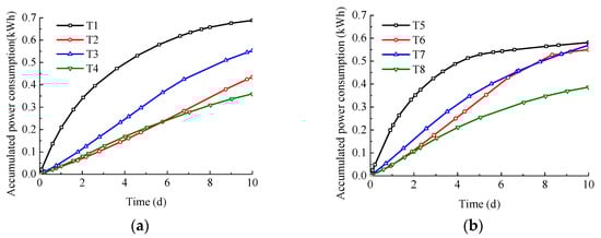 Accumulated energy consumption over 10 days. (a) EK Remediation; (b) EK-PRB Remediation.