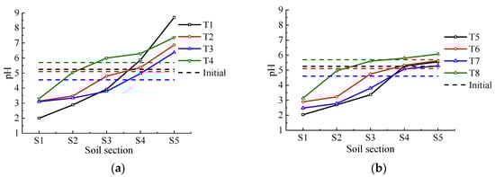 Changes of soil pH in different sections after electrokinetic remediation. (a) EK Remediation; (b) EK-PRB Remediation.