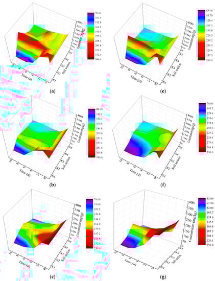 Figure 5 shows the concentration of contaminants in the S1–S5 section for eight groups of tests during the 10-day electrokinetic remediation. The contaminants accumulate in the S1 section at the beginning of the repair. Electrolytes in soil react with heavy metals and form an electronegative metal complex, which will migrate to the anode when it is under an acidic condition. Then, the metal complex disintegrates and releases the positive metal ion. These metal ions will migrate to the cathode, and some of them form a metal complex in the soil during migration, which moves to the anode again. It is the above cyclic process that produces the highest concentration of Cu in S1 in the first two days of the tests.