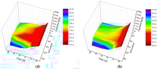Changes in concentration of contaminants during electrokinetic remediation. (a) T1; (b) T2; (c) T3; (d) T4; (e) T5; (f) T6; (g) T7; (h) T8.
