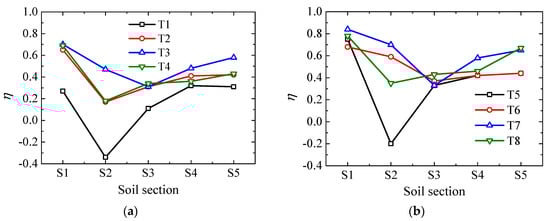 Figure 4 shows the pH values of initial soil and after remediation for 10 days. The pH value of the soil increases from the anode to the cathode. The pH-value change in soil is mainly caused by the movement of H+ and OH− produced by water electrolysis reaction on the anode and cathode, through electromigration, electroosmotic flow, electrophoresis, and diffusion. After 10 days of remediation, the section in the soil close to the initial pH value is closer to the cathode (between S3–S4) because the migration velocity of hydrogen ions is faster than hydroxide ions []. The cathode will be gradually alkaline as the repair progresses by using electrokinetic remediation alone. The pH values of the soil near the cathode (S3-S5) are higher than the initial pH values on day 10 of the repair, especially for T1 and T4; they can reach 7.1 or more. This is not conducive to the removal of Cu because Cu2+ easily forms copper hydroxide precipitates with hydroxide ions, blocking the soil pores and causing the accumulation of heavy metals at higher pH values. Figure 4b shows that the pH values near the cathode of T5–T8 are all less than six, indicating that the steel slag PRB is beneficial to maintaining the soil pH value free from the influence of the catholyte, thus facilitating the removal of Cu.