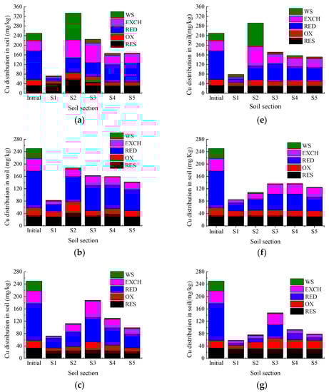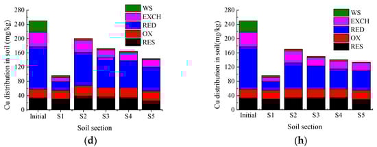 Fractionation change of Cu after EK tests. (a) Test 1; (b) Test 2; (c) Test 3; (d) Test 4; (e) Test 5; (f) Test 6; (g) Test 7; (h) Test 8.